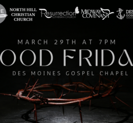 The annual Community Good Friday service will be held at Des Moines Gospel Chapel this year on March 29. Plan now to attend this inspiring event! Need a ride? Email (office@midwaycovenant.org) or phone the office.